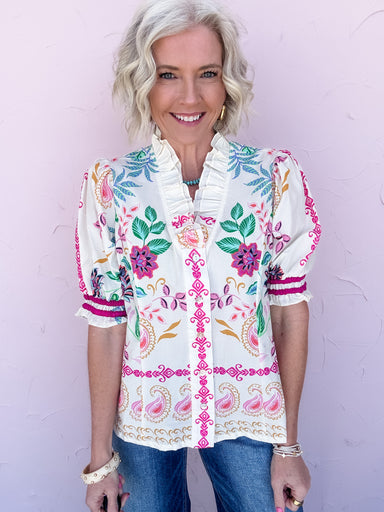 The Brightfolk Bloom Top is pure joy in blouse form. This lightweight cotton beauty features a vibrant floral and paisley print, a ruffled split ne...