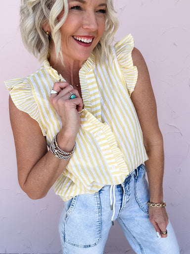 The Lemon Drop Lines Top is pure sunshine in the sweetest little silhouette. Designed with soft yellow and white stripes, a flattering split neckli...
