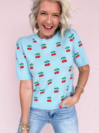 The Fresh Pick Knit Top is the kind of playful piece that instantly brightens your day. Featuring a soft knit feel with an allover cherry print, pu...