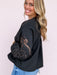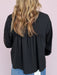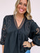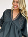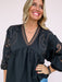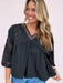 This black blouse stands out with its beautifully stitched tan embroidery that gives it an artful, handcrafted feel. The relaxed, flowy silhouette pairs effortlessly with denim for an easy but elevated everyday look. With its unique sleeve cutouts and detailed neckline, it brings just the right mix of texture, charm, and desert-inspired character.