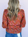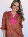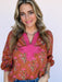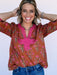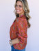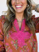 Bring a little heat to your fall wardrobe with the Flora & Flame Top. The warm rust backdrop and bold pink floral print create an eye-catching combo, complete with statement trim that adds a playful touch. Pair it with denim or cream trousers for everything from weekend brunch to casual days at the office.