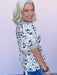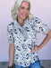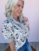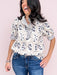 This patterned blouse blends a charming navy floral design with playful striped details for a look that feels both polished and fun. The ruffled neckline and puff sleeves add a touch of femininity without being fussy, making it an easy standout piece. Light, comfortable, and full of personality, it pairs effortlessly with denim for an elevated everyday outfit.