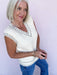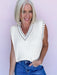 Update your wardrobe with the Corner Cafe Sweater Vest, a cream-colored cable knit piece featuring black stitch detailing. Its flattering v-neckline offers versatile styling options, allowing you to wear it as a standalone top or effortlessly layer it for added warmth. This vest combines timeless design with modern appeal, making it an essential addition that enhances any outfit with cozy sophistication.