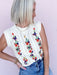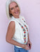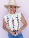 Fit: True to size, sleeveless sweater vest silhouette, ribbed neckline and hem, open stitch and embroidered front detail