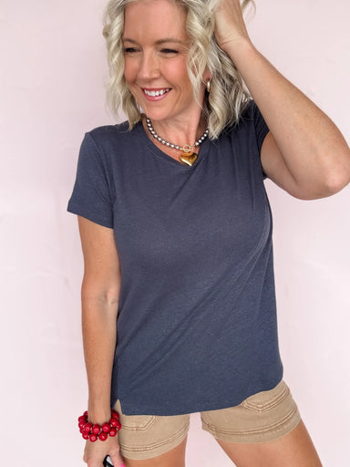 The Mapmaker Tee offers a refreshing take on casual comfort with its lightweight linen blend fabric in a soothing charcoal hue. Featuring a crewnec...