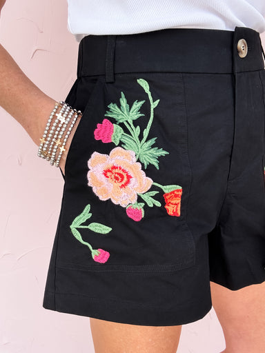 The Floral Affair Shorts are bringing a little drama in the best way. These black cotton shorts feature vibrant embroidered florals on the front pa...