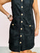 Fit: Sleeveless shift silhouette with gold button front, patch pockets, and soft stretch feel.