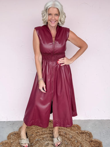 Step out in style with the Make Your Way Midi Dress in rich burgundy faux leather. This sleeveless dress features a flirty V-neckline and a daring ...