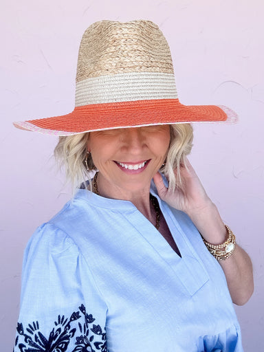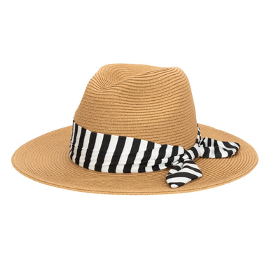 This classic straw fedora gets a playful twist with its bold, striped scarf band. The lightweight woven design keeps things breezy while the knotte...