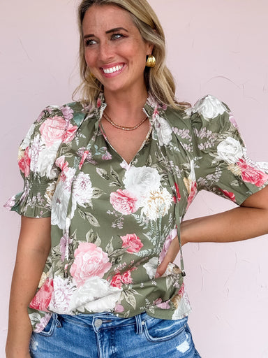 The Perfect Match Top combines lightweight cotton comfort with a stunning floral print set against an olive background. Its split neck features an ...