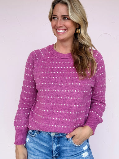 Wrap yourself in cozy charm with the Kindred Spirit Sweater. This soft magenta knit features a playful ivory polka dot stripe pattern that adds a d...