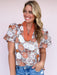 Your fall lineup just got a major upgrade. This floral beauty mixes warm pumpkin tones with crisp whites and earthy browns—basically pumpkin spice in shirt form! The puff sleeves give it that playful touch while the bold neckline adds just the right amount of pop. Perfect for coffee runs, or just feeling festive without trying too hard!