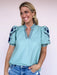 • Style Notes: Teal body with navy embroidery, puff sleeves, split neckline