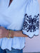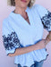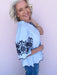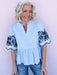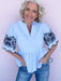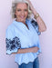 The Sunday Stitched Top is one of those easy favorites that feels special without trying too hard. This soft blue cotton blouse features a flattering split neckline, delicate dark navy floral embroidery on the flutter sleeves, and scalloped trim along the hem and cuffs for that extra little detail we love. Pair it with your go-to denim for church, brunch, or a slow Sunday stroll downtown.