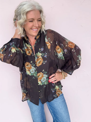 The Under the Moon Top brings a touch of quiet drama to your wardrobe. Designed in a soft black fabric with a delicate tan floral print, it feature...