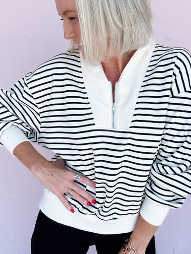 Add a splash of fun to your wardrobe with the Let it Slide Pullover! Featuring bold off-white and black stripes, a half-zip front for easy layering...