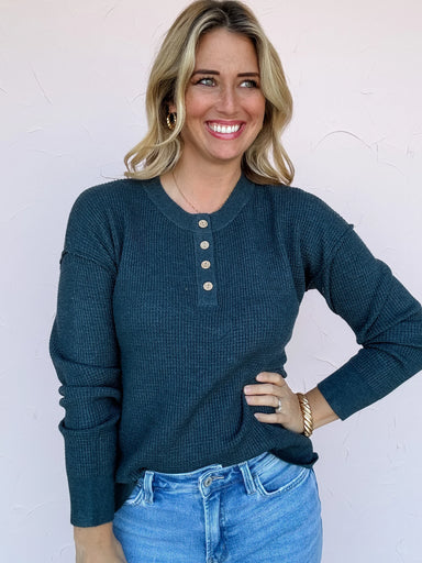 Fresh and effortless, this waffle-knit henley brings cool-weather vibes with its rich fall hue and laid-back texture. Natural wood buttons add a mo...