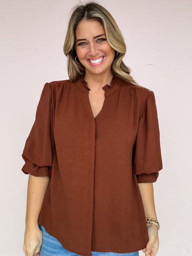 The Night To Remember Top brings effortless sophistication with a touch of charm. Featuring a ruffled neckline, subtle v-cut detail, and flowy 3/4 ...