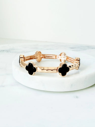 Good vibes only with this hammered gold stretch bracelet featuring sweet clover charms. Choose between classic black, pearly white, or a rich green...