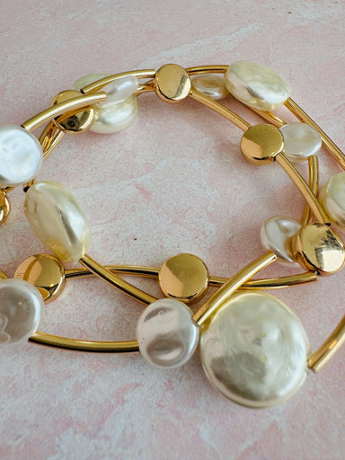 Revel in the tranquility of the Serene Shore Bracelet Set. Featuring delicate golden wire, beaded with freshwater coin pearls, this set exudes coas...