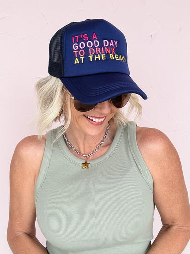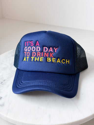This navy colored mesh trucker hat brings the good vibes with bold, colorful embroidery that says exactly what we’re all thinking. Lightweight and ...