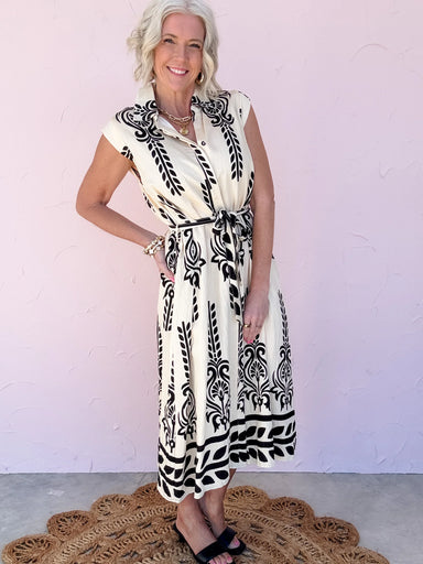 The Bold Balance Midi Dress brings together eye-catching pattern and easy wearability in one polished piece. Designed with a cream base and bold bl...