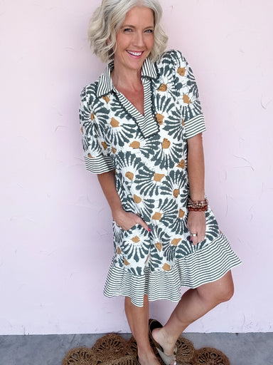 The Electric Avenue Dress is that bold pop of blue your closet has been waiting for! Featuring a classic collared neckline, full button-down front,...