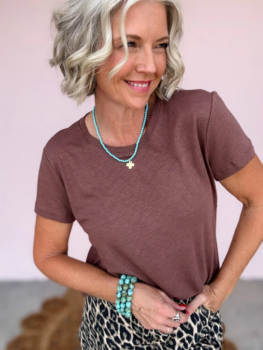 The Mapmaker Tee offers a refreshing take on casual comfort with its lightweight linen blend fabric in a trendy chocolate hue. Featuring a crewneck...