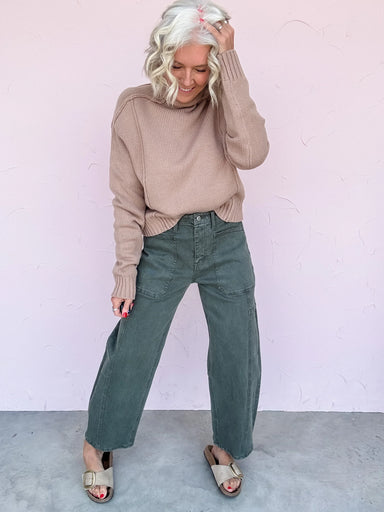 Step out in style with these washed green, high-rise jeans that bring a fresh twist to your wardrobe. Featuring trendy barrel legs and handy cargo-...