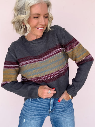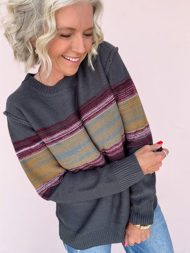 Stay cozy and stylish with the Off the Clock Sweater. This medium-weight knit in rich charcoal features an earthy multi-colored stripe pattern acro...