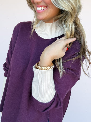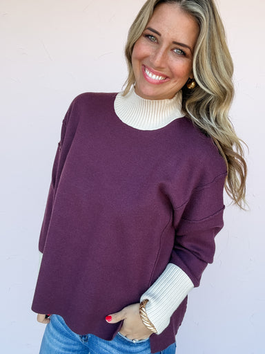 The Evening Fade Sweater brings cozy contrast and modern charm to your fall lineup. The deep plum body pairs perfectly with soft ivory ribbed trim ...