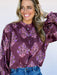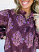 This plum-toned floral top brings a charming mix of whimsy and richness with its berry-inspired hues and soft, scattered blooms. The button-front neckline and billowy sleeves create an effortless, feminine silhouette that feels special without trying too hard. Light, airy, and easy to style, it’s the perfect popover for adding a touch of color to your everyday lineup.