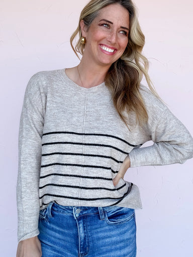 The Weekender Stripe Sweater brings a timeless touch to your casual lineup. Designed in a soft, lightweight knit, this neutral tan pullover feature...