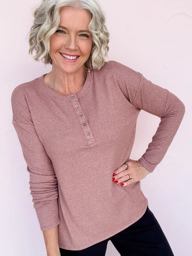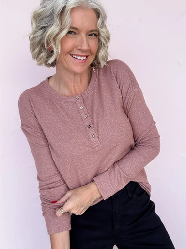Cozy up in the Homebody Henley Top, a lightweight, soft knit top that feels like a warm hug. Its cocoa color with subtle mauve undertones adds a fu...