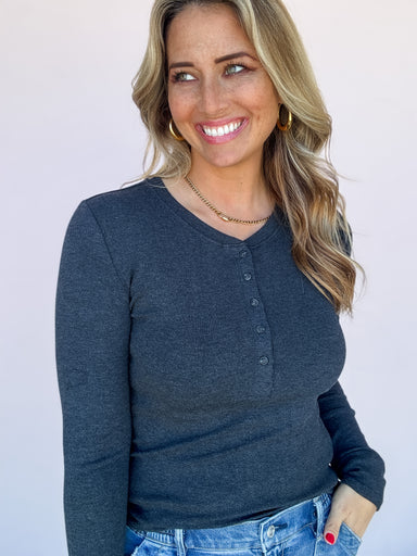 The Emberline Top combines softness and comfort in a heathered charcoal shade. Featuring a half-button front and long sleeves, it’s ideal for weari...