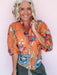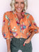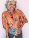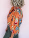The Sundew Petal Top features a lightweight, vibrant orange fabric adorned with a beautiful multi-colored botanical print. Its split neck with ruffle detailing and button-down front add charming touches, while the 3/4 length billowy sleeves offer comfort and style. Ideal for transitioning between seasons, this top brings a fresh, breezy feel to your everyday look.