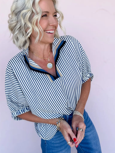 FINAL SALE: NO REFUNDS/ EXCHANGES The Retro Motion Top brings all the nostalgic charm in an easy, everyday style. With navy and rust-orange str...