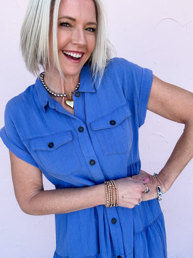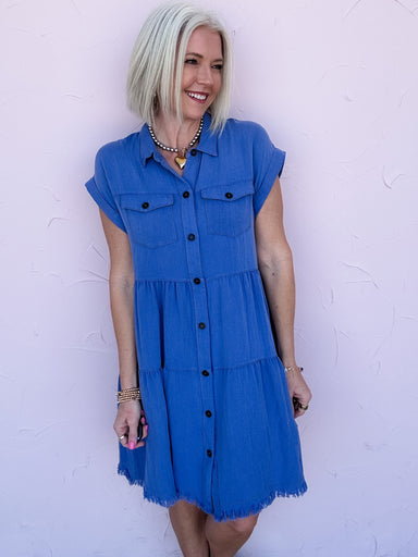 The Electric Avenue Dress is that bold pop of blue your closet has been waiting for! Featuring a classic collared neckline, full button-down front,...