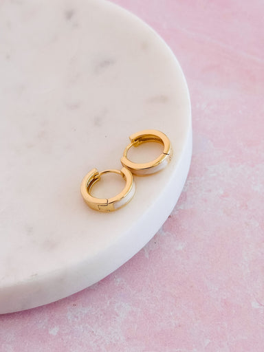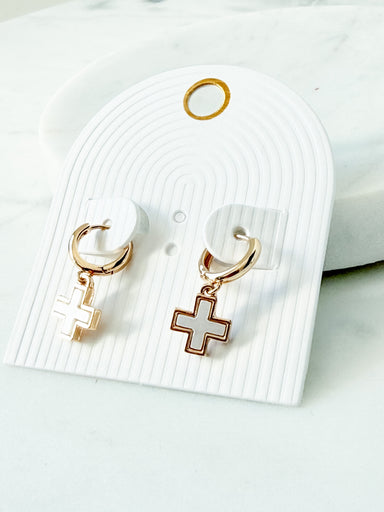 Simple yet striking! These gold enamel cross hoops bring just the right amount of shine to your everyday look. Perfect for coffee runs, Sunday brun...