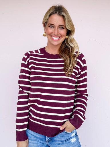 When in doubt, stripes win! This berry-hued pullover with crisp ivory stripes brings just the right mix of classic and fun. Easy to wear, easy to s...