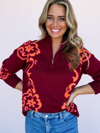 The Ruby Road Sweater is the perfect mix of classic charm and cozy attitude. This burgundy half-zip pullover features bold orange and hot pink flor...