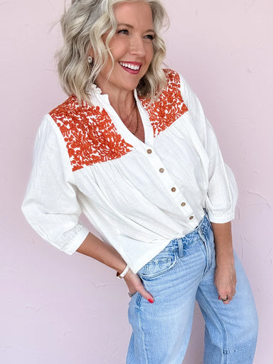 The Brightfolk Bloom Top is pure joy in blouse form. This lightweight cotton beauty features a vibrant floral and paisley print, a ruffled split ne...
