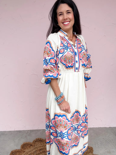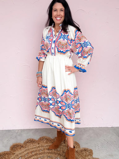 The Painted Mosaic Dress is a walking piece of art with its bold, intricate print and eye-catching border detail. Featuring a flattering elastic wa...