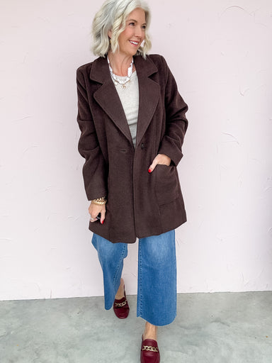 The After Hours Coat brings a timeless polish to any outfit. With its soft, structured feel and rich chocolate brown hue, this coat blends cozy war...