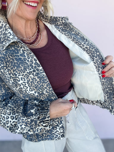 The Spotlight Jacket brings fierce confidence to your cool-weather lineup. Designed in a bold cheetah print with a classic zip-front style and elas...