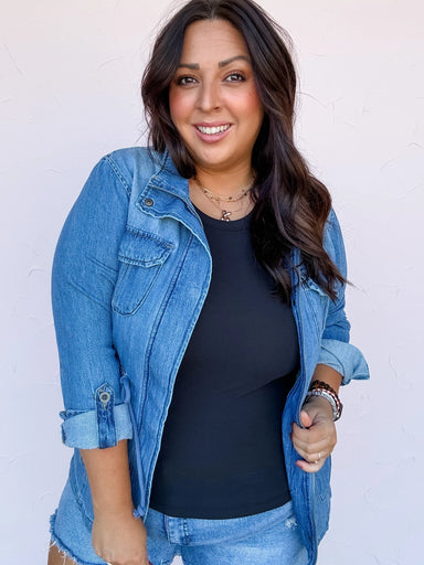 Experience the ultimate in trendy style with our Crossroads Denim Jacket! This super cute utility style jacket features a longer length, zipper fro...