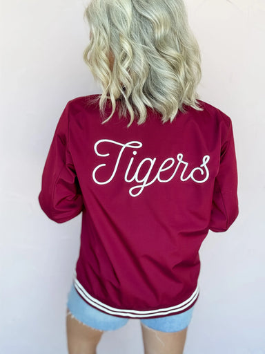 Show your Dripping Springs Tiger pride in style with this custom maroon varsity jacket. Featuring "Tigers" embroidered in bold white on the back, s...