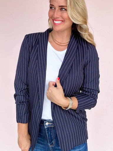 The Hillhouse Blazer combines classic navy with delicate off-white pinstripes for a refined look. Its 3/4 length ruched sleeves add a unique, flatt...