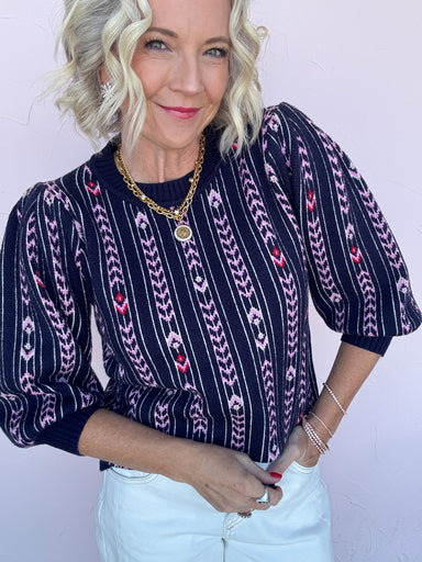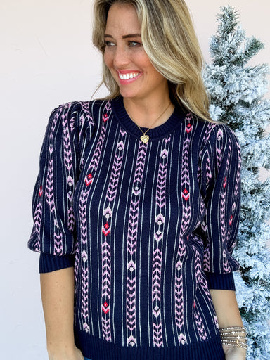 Frostline Pattern Sweater features a rich navy base with intricate pink, white, and red woven details that feel both wintry and fun. The vertical p...