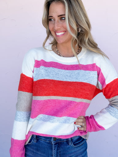 The Bright Chill Stripe Sweater brings bold, happy energy to cooler days with its fun mix of vibrant pinks, soft grays, and warm reds. It’s lightwe...